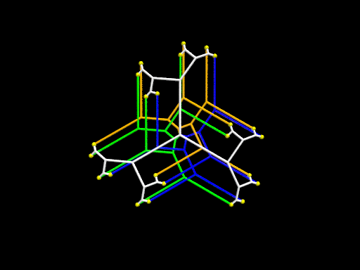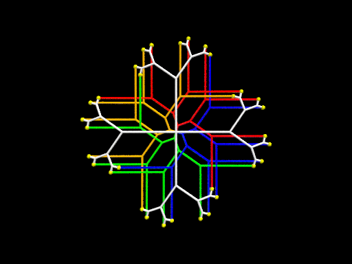 Détaillons le premier dessin. On y voit en blanc un arbre ternaire dont six branches sont issues du centre, chaque branche se divisant en trois sous-branches et celles-ci se divisant encore en trois. On arrête à ce niveau les itérations pour des raisons de lisibilité mais on aurait pu continuer. La longueur d’une sous-branche par rapport à la longueur de la branche dont elle est issue est dans un rapport r inférieur à 1, constant à chaque subdivision. Les trois angles des sous-branches par rapport à la direction de la branche sont également les mêmes à chaque subdivision (ici -30°, 30°, 90°). Ces angles différent entre eux de 60° ou 120°, et ces dernières valeurs engendrent un groupe G de six éléments modulo 360°, à savoir les six multiples de 60°. L’ordre de ce groupe, égal à six, est la raison pour laquelle l’arbre blanc possède six branches au départ. Les feuilles finales de l’arbre blanc sont représentées par des petites boules.