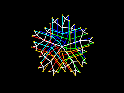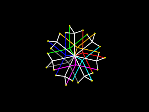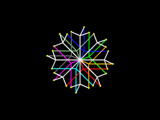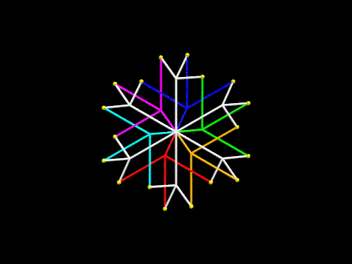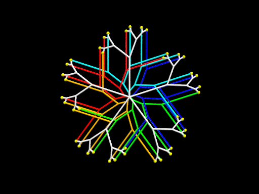 Cet arbre est associé à un arbre dit inverse, construit de la façon suivante. Ses six branches initiales (de six couleurs différentes) sont choisies de telles façon qu’elles aient même longueur et même orientation que les sous-branches finales de l’arbre initial. Lors d’une subdivision, les sous-branches de l’arbre inverse ont une longueur multipliée par 1/r par rapport à la longueur de la branche qu’elles suivent, et les trois angles que forment ces sous-branches par rapport à la direction de la branche sont les opposés des angles de l’arbre blanc.